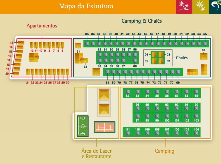 Estrutura geral: Em uma área de 60.00 km2 a capacidade de instalação é de aproximadamente 500 barracas, divididas em quadras separadas, pontos de luz em cada quadra, pias para lavar roupa e louça, choupanas com fogões coletivos e churrasqueiras. Possuem uma cozinha comunitária muito bem equipadas com churrasqueiras e fogões cooktops.