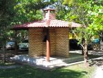 Estrutura geral: Camping gramado e arborizado, portaria controlada, cozinha comunitária com fogão, geladeira e churrasqueiras coletivas em local coberto com mesas e bancos.