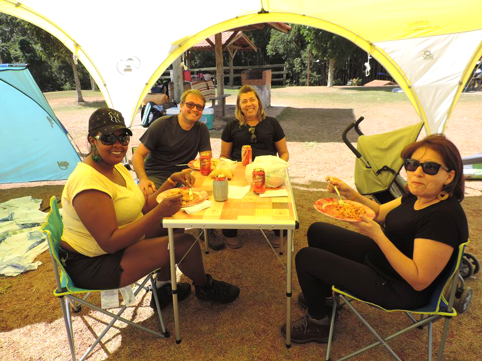 Dentro de nossa programação teve caminhada para as cachoeiras, almoço com churrasco, jantar com cachorro quente e caldo de cabotia, fogueira e até uma macarronada no domingo! Foram momentos de muita alegria e descontração em meio a natureza exuberante!