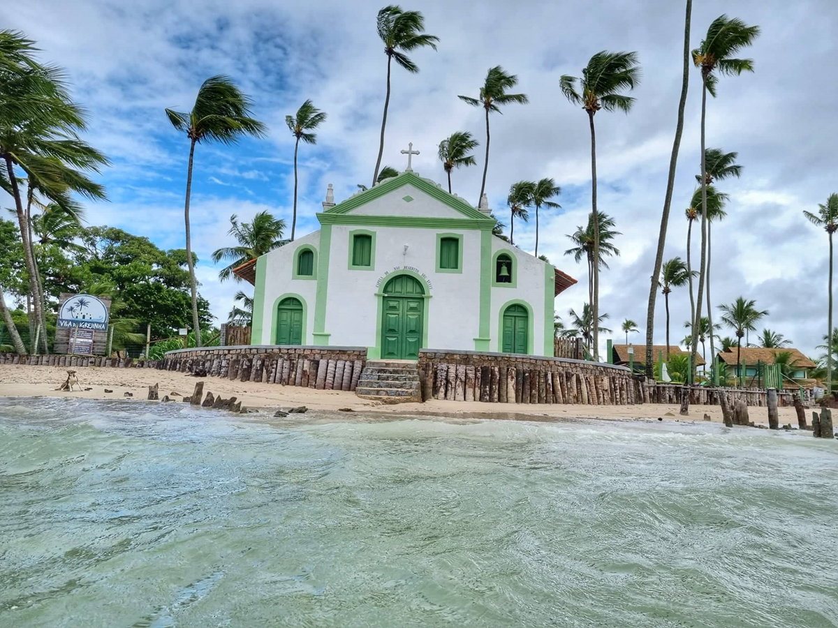 A praia mesmo com o tempo nublado é bem bonita e fizemos também a caminhadinha para tirar a foto clássica na igrejinha, embora a charmosa capelinha seja conhecida por todos como igrejinha de Carneiros, o nome oficial da igrejinha na Praia dos Carneiros é Capela de São Benedito.