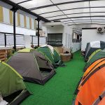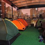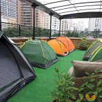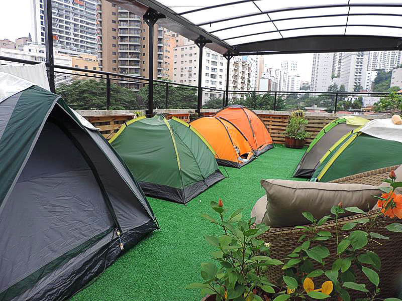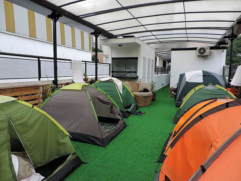 A área de camping fica na cobertura do prédio de 4 andares e funciona como uma nova opção de hospedagem na cidade. O piso é de grama sintética, a cobertura retrátil em caso de chuva, banheiros femininos e masculinos com chuveiros com água quente e limpos, cozinha comunitária muito bem montada e Wi-Fi.