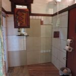 O banheiro para a área de camping é unissex muito bem limpo, com chuveiro quente e decoração diferenciada.