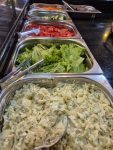 diversas opções de saladas, pratos quentes variados, carnes assadas e na chapa. Tudo isso em um ambiente agradável e acolhedor.