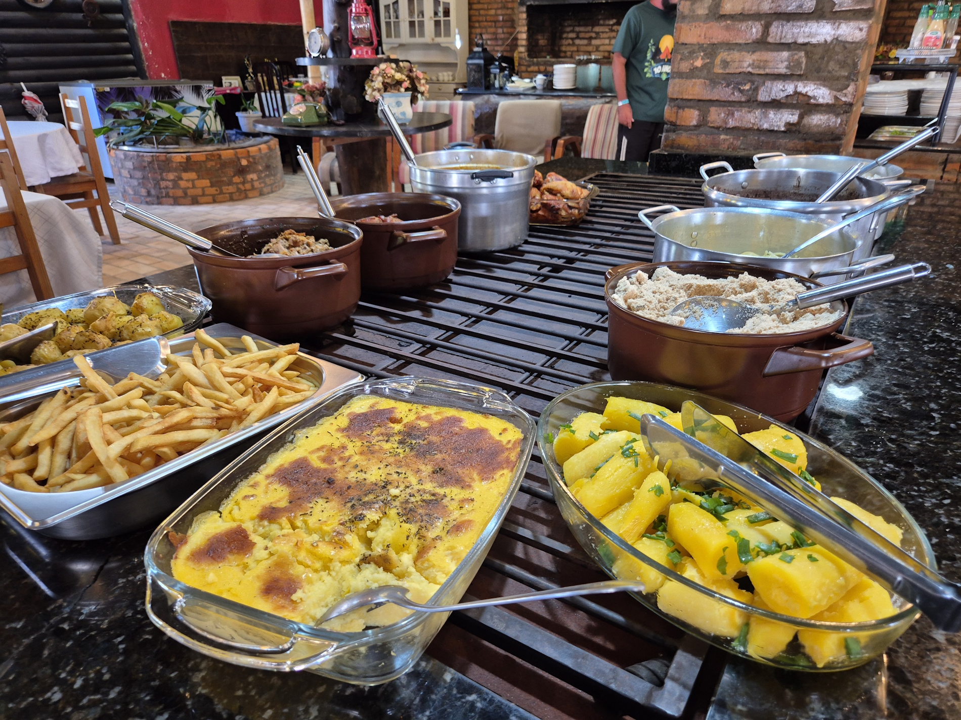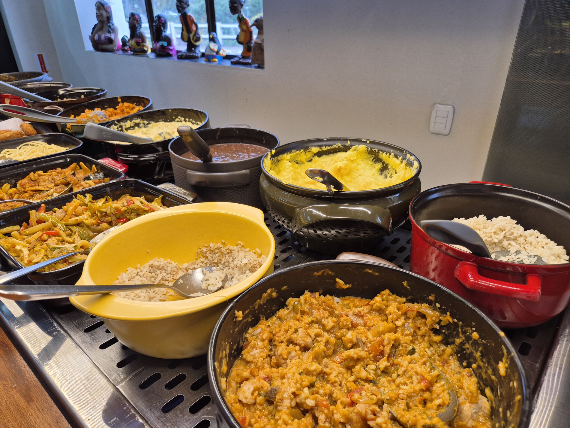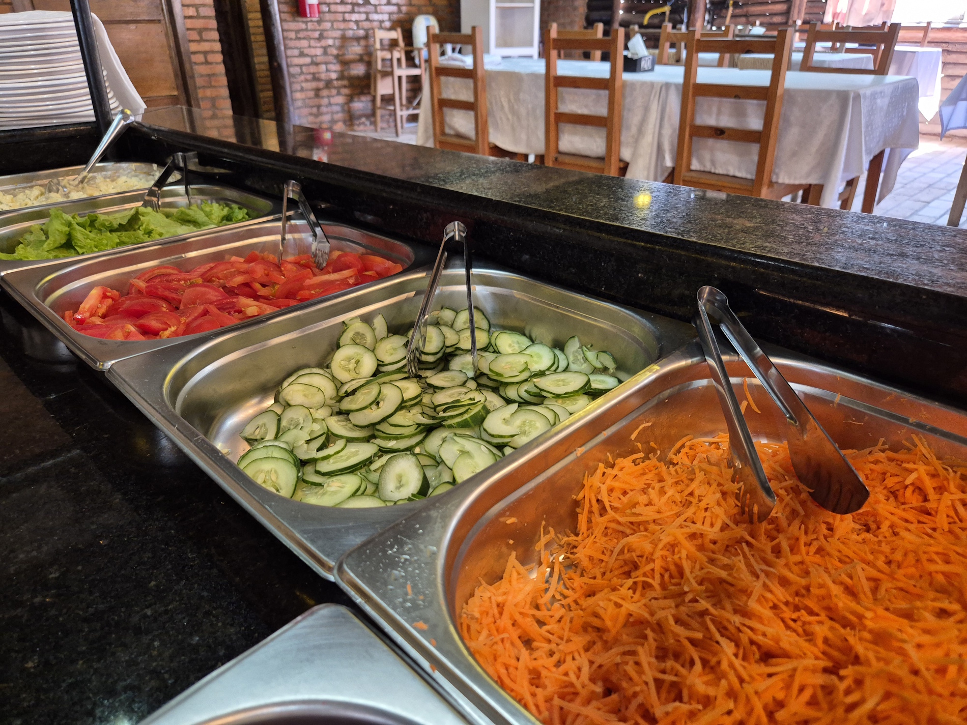 diversas opções de saladas, pratos quentes variados, carnes assadas e na chapa. Tudo isso em um ambiente agradável e acolhedor.