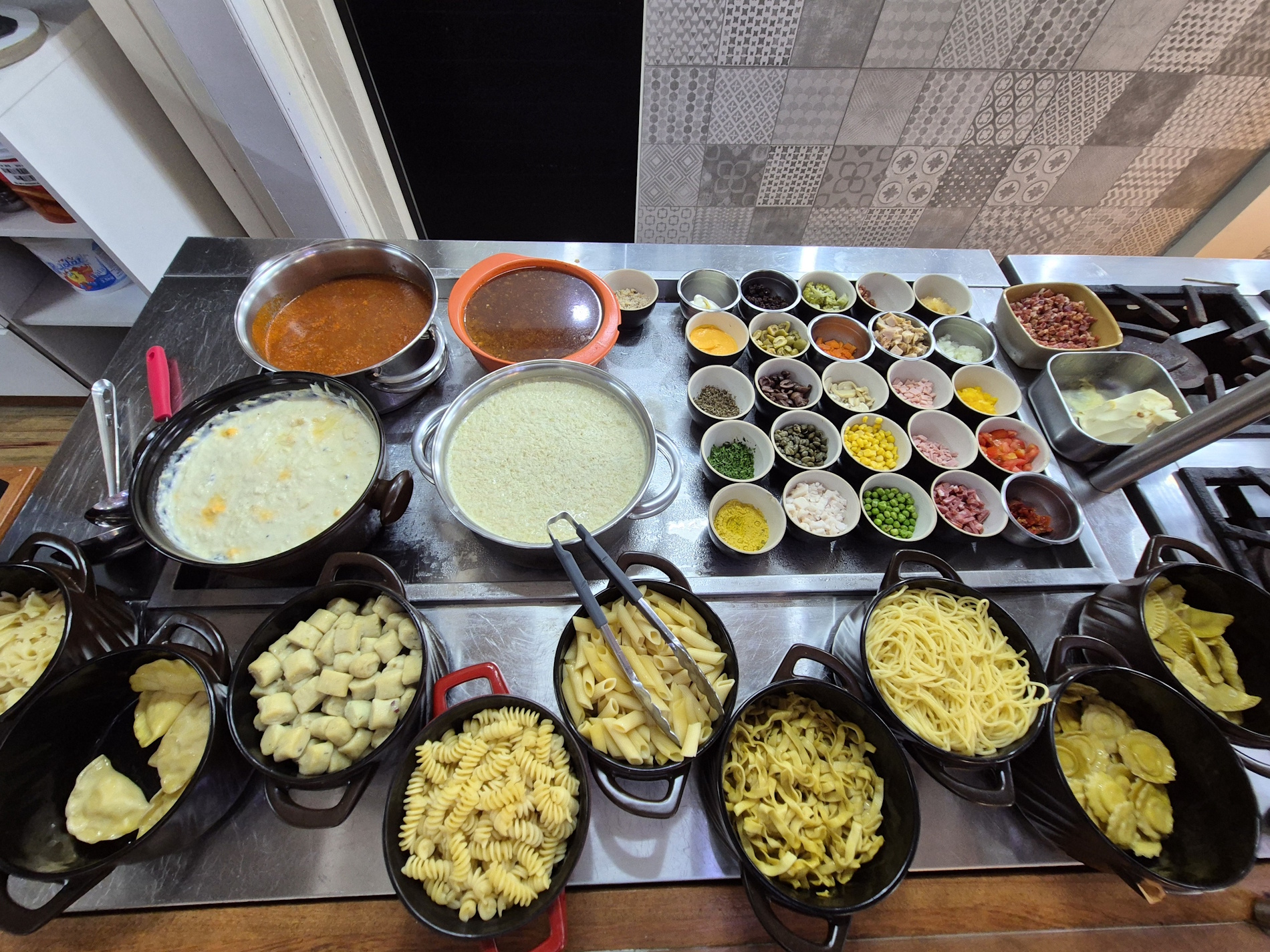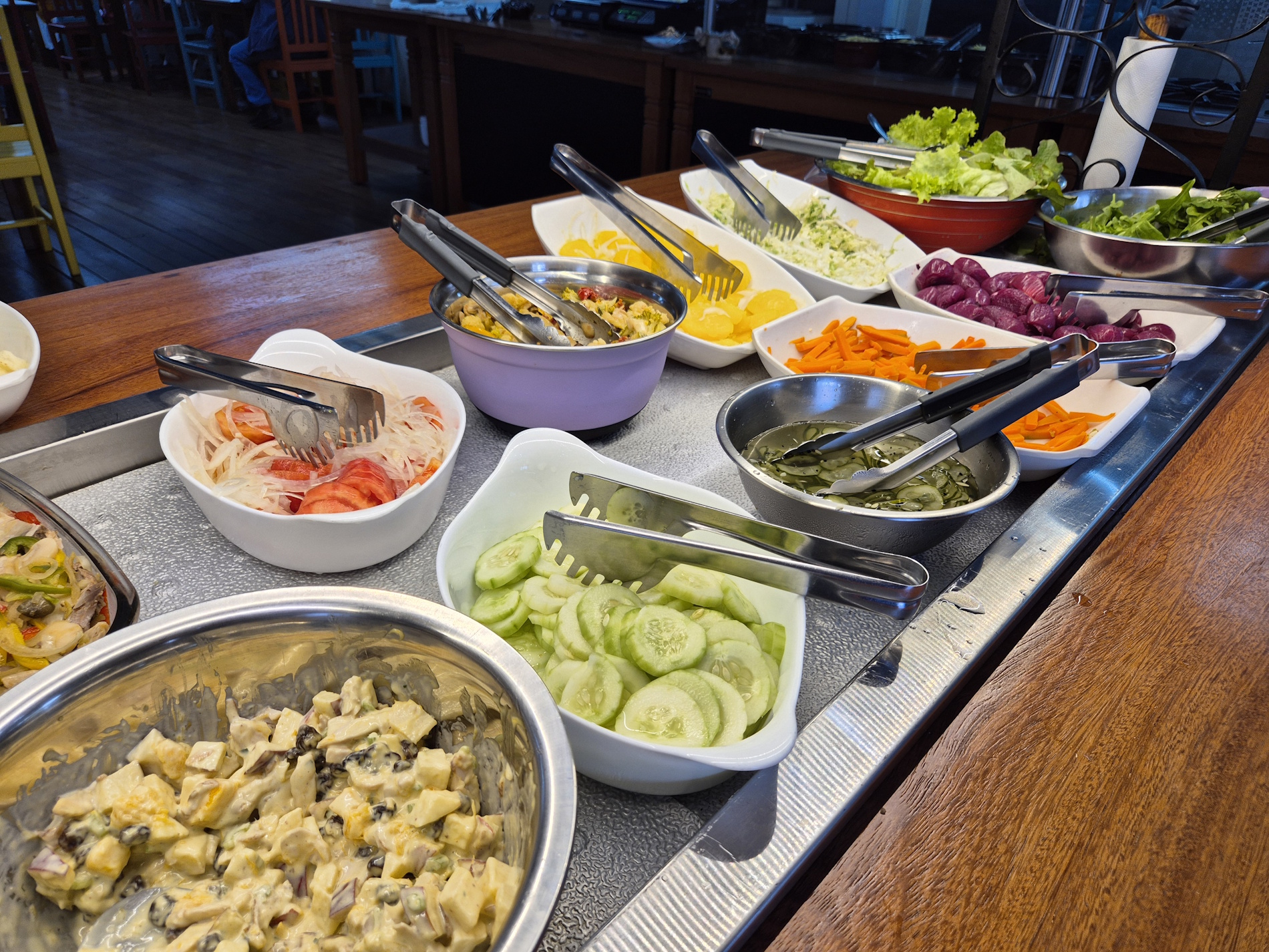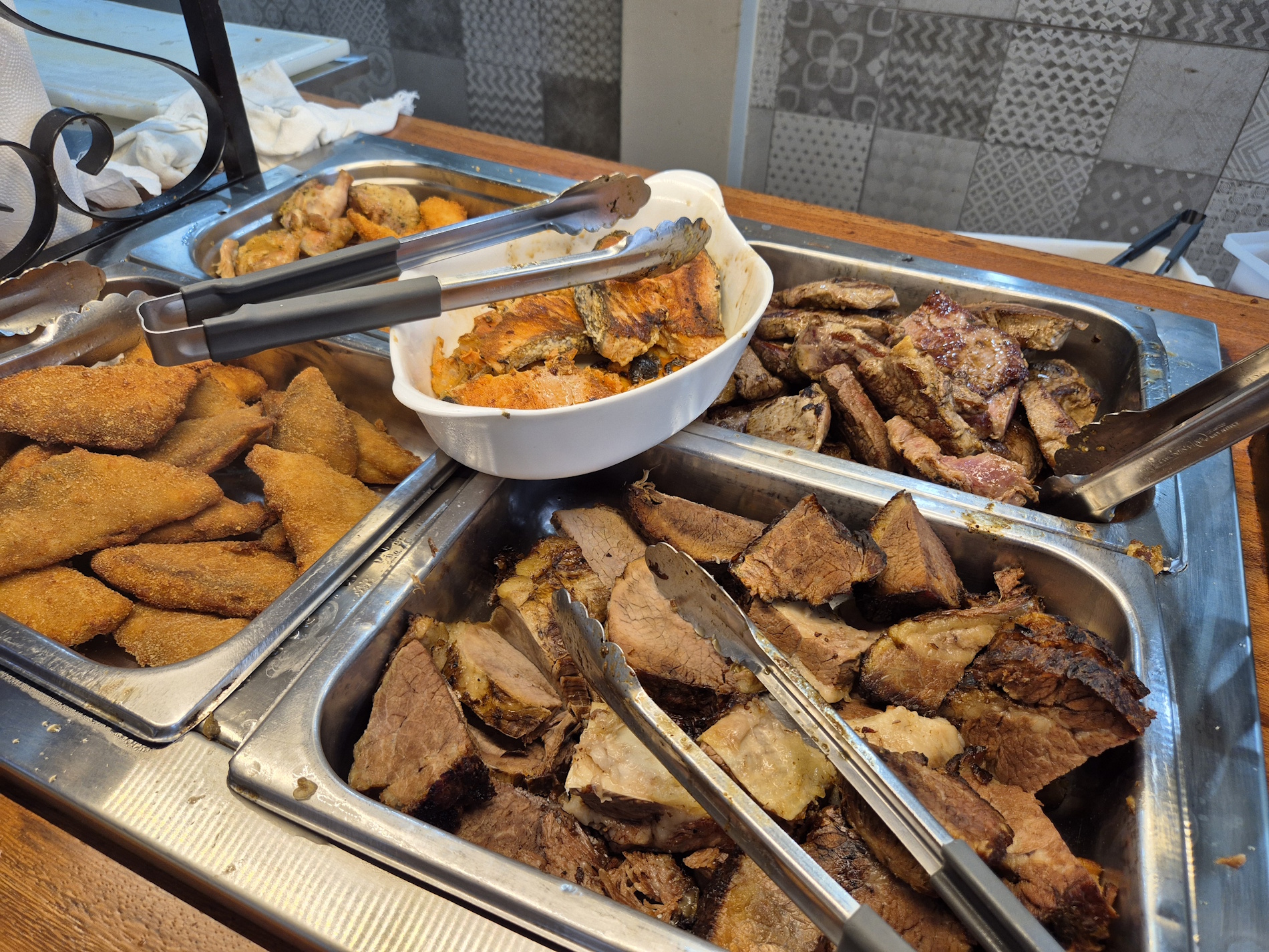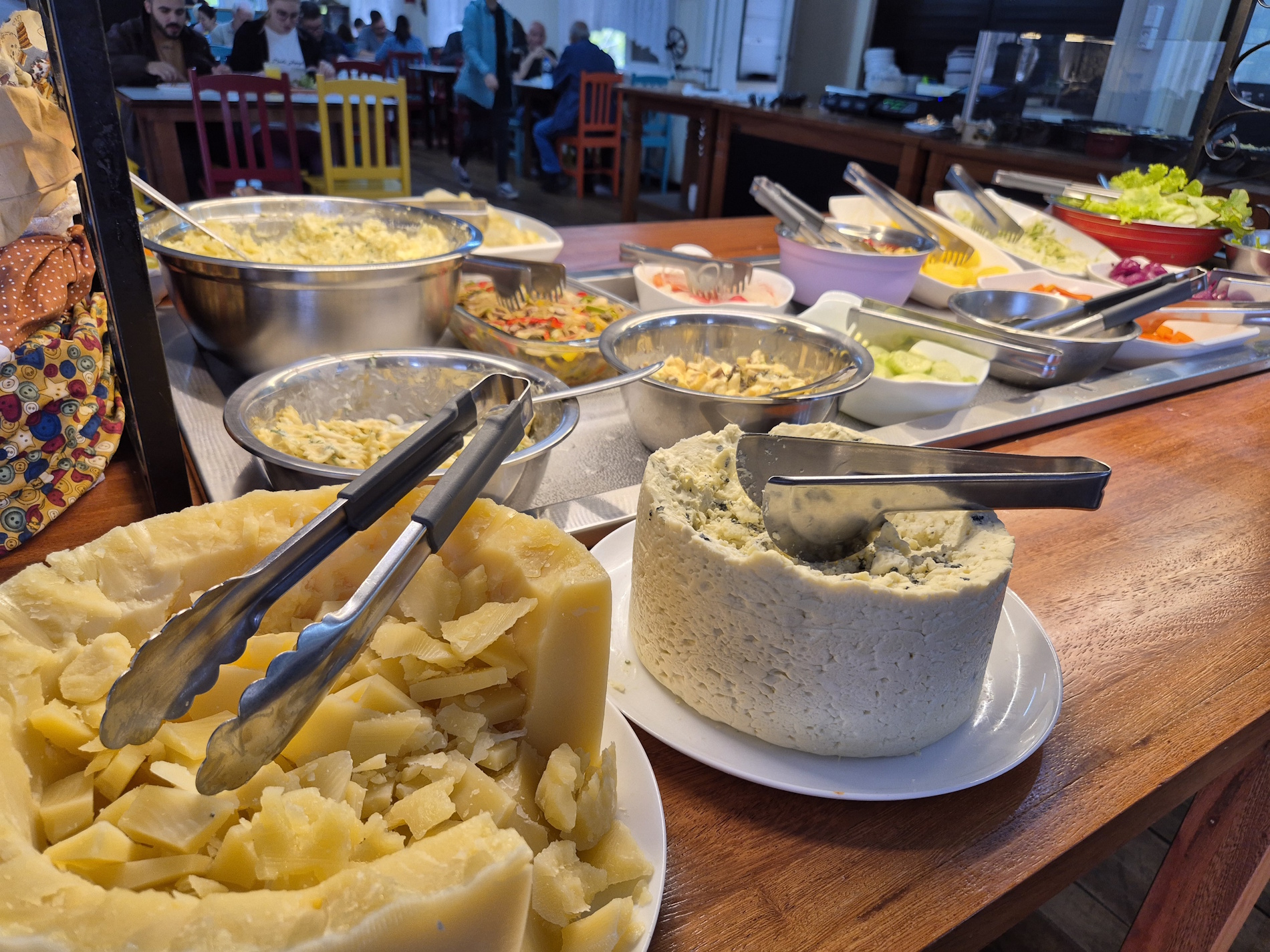 diversas opções de saladas, pratos quentes variados, carnes assadas e na chapa. Tudo isso em um ambiente agradável e acolhedor.