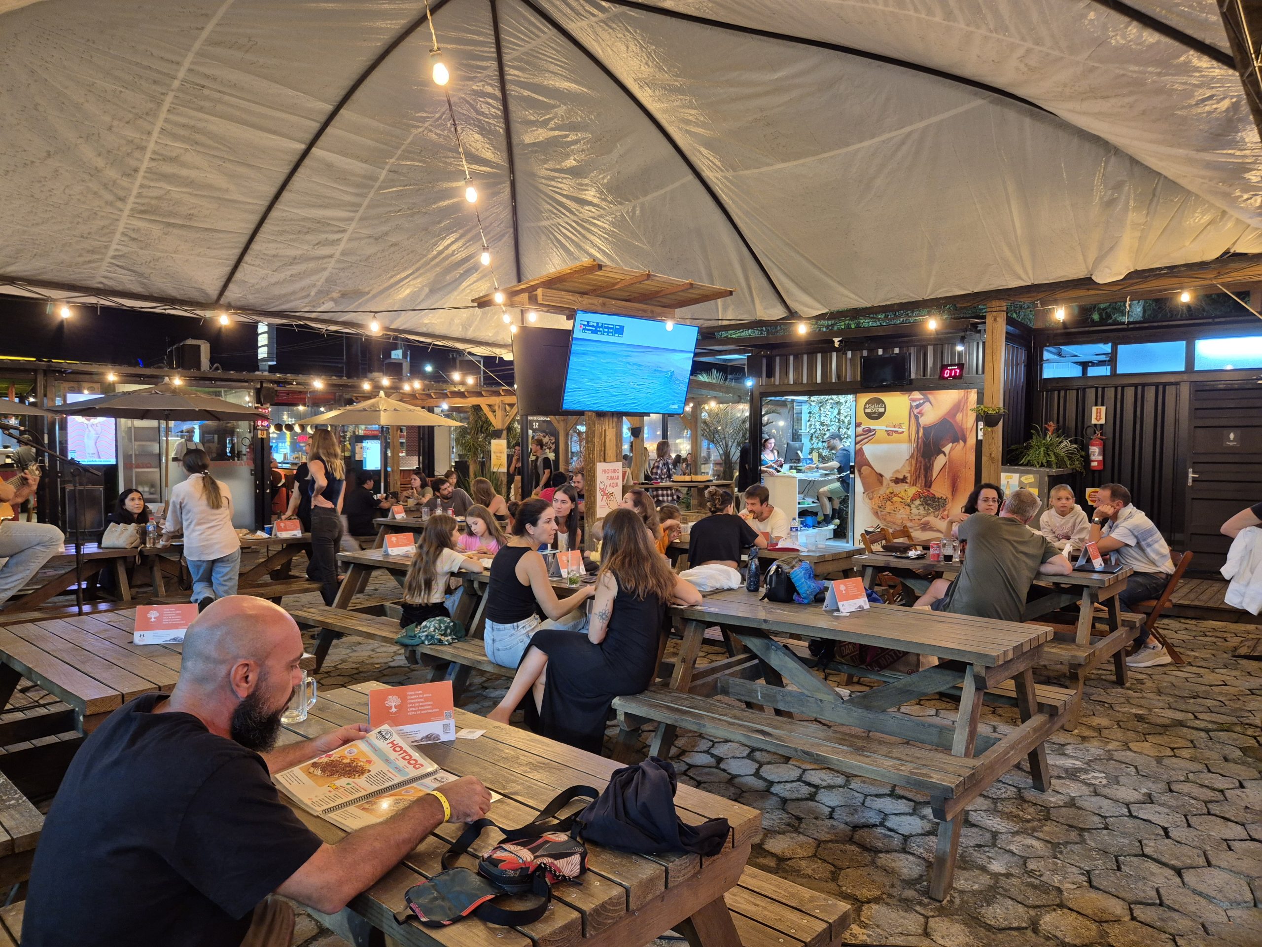 Bem na praça central do camping fica o Quiosque Aloha do nosso amigo Waldo que funciona o ano inteiro servindo muitas opções que atendem do café da manhã até o jantar.