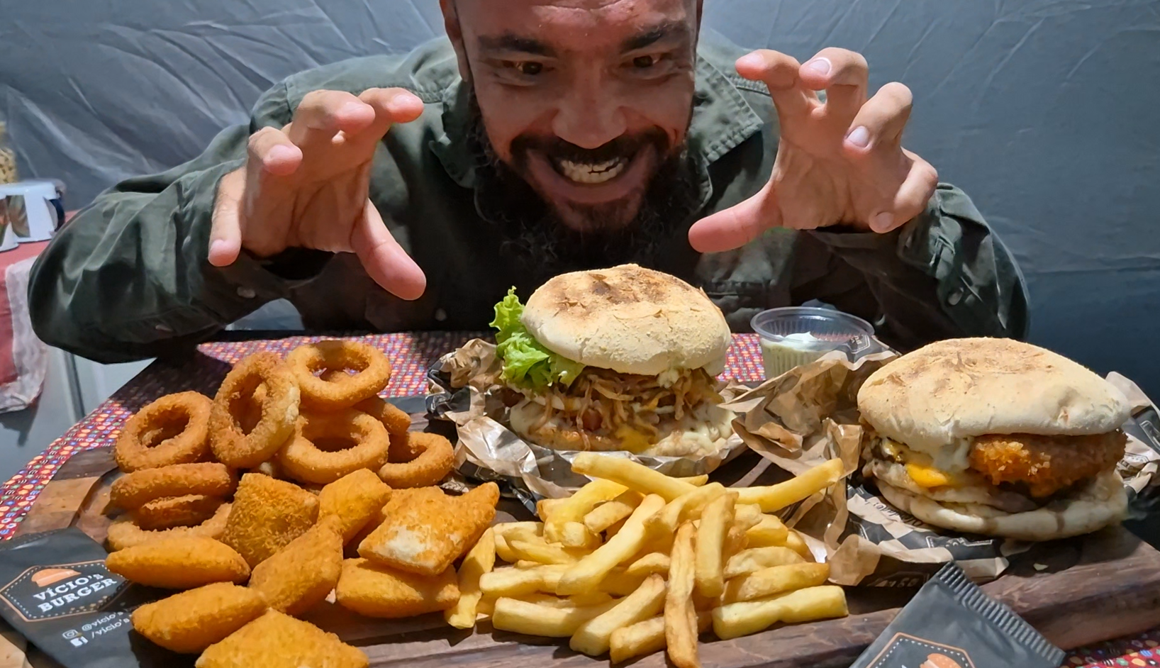 O Vicios serve burguer de verdade, assados na churrasqueira a carvão com aquele sabor defumado que alegra o paladar. Nós nos deliciamos com os lanches, batata frita, queijo gouda empanado e anéis de cebola crocantes! Confere ai!