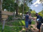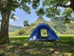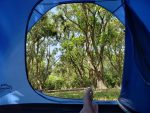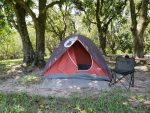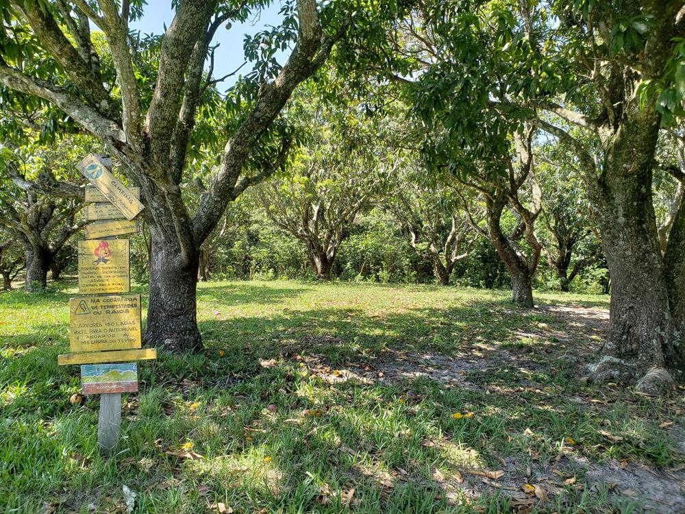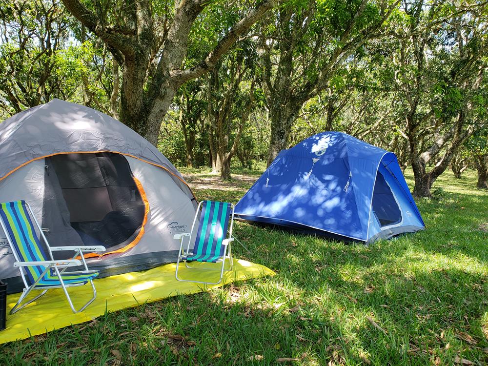 A estrutura para camping é bem simples e tem apenas um banheiro feminino e um masculino e não possui energia elétrica. Foi o camping mais roots em que acampamos nesses quatro anos de estrada. Aproveitamos a sombra das mangueiras para montar nossas barracas.