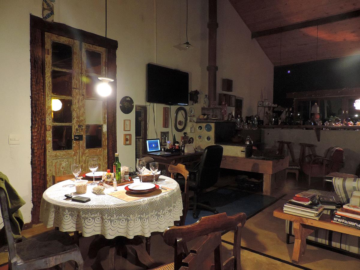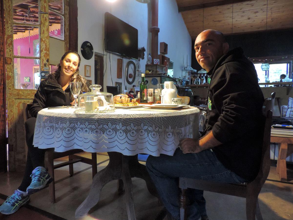 De volta a Pousada fomos recebidos pala Ju que nos esperava com um delicioso caldo de abóbora e calabresa. Conhecemos a Lu que mora em BH, sentamos ao lado do fogão a lenha e ficamos os quatro batendo um bom papo e curtindo um vinhozinho.