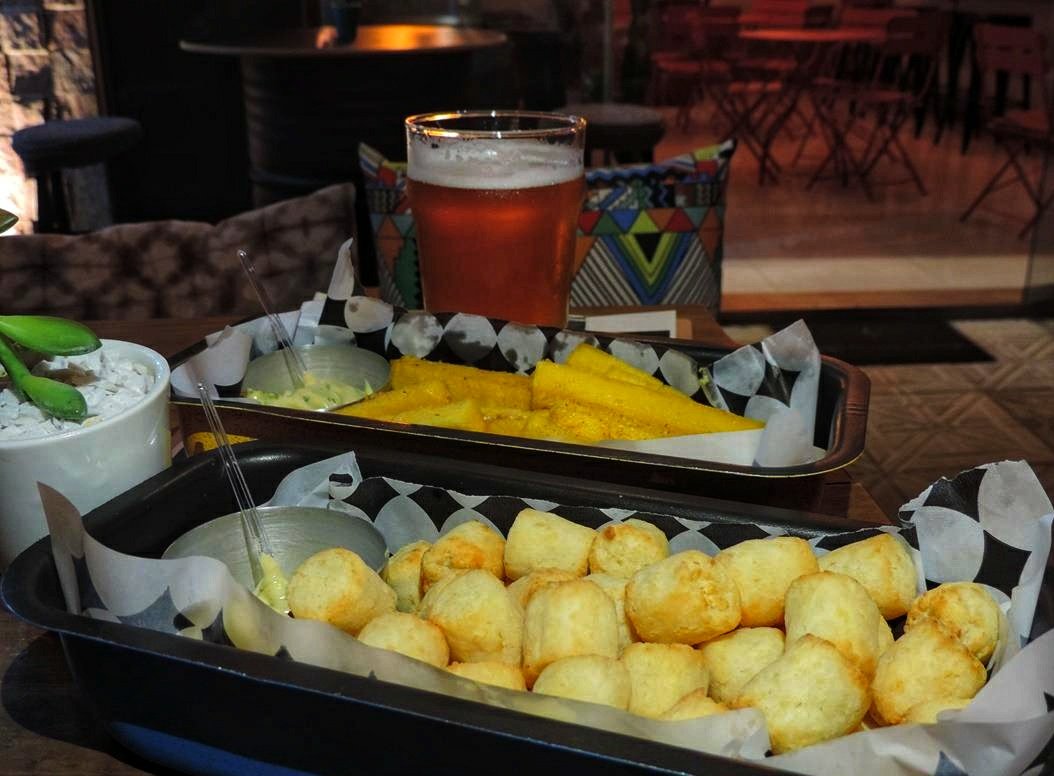Provamos as porções de polenta frita e bolinho de aipim acompanhadas de cerveja artesanal e pedimos os lanches!