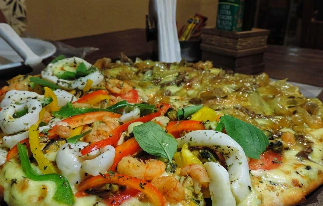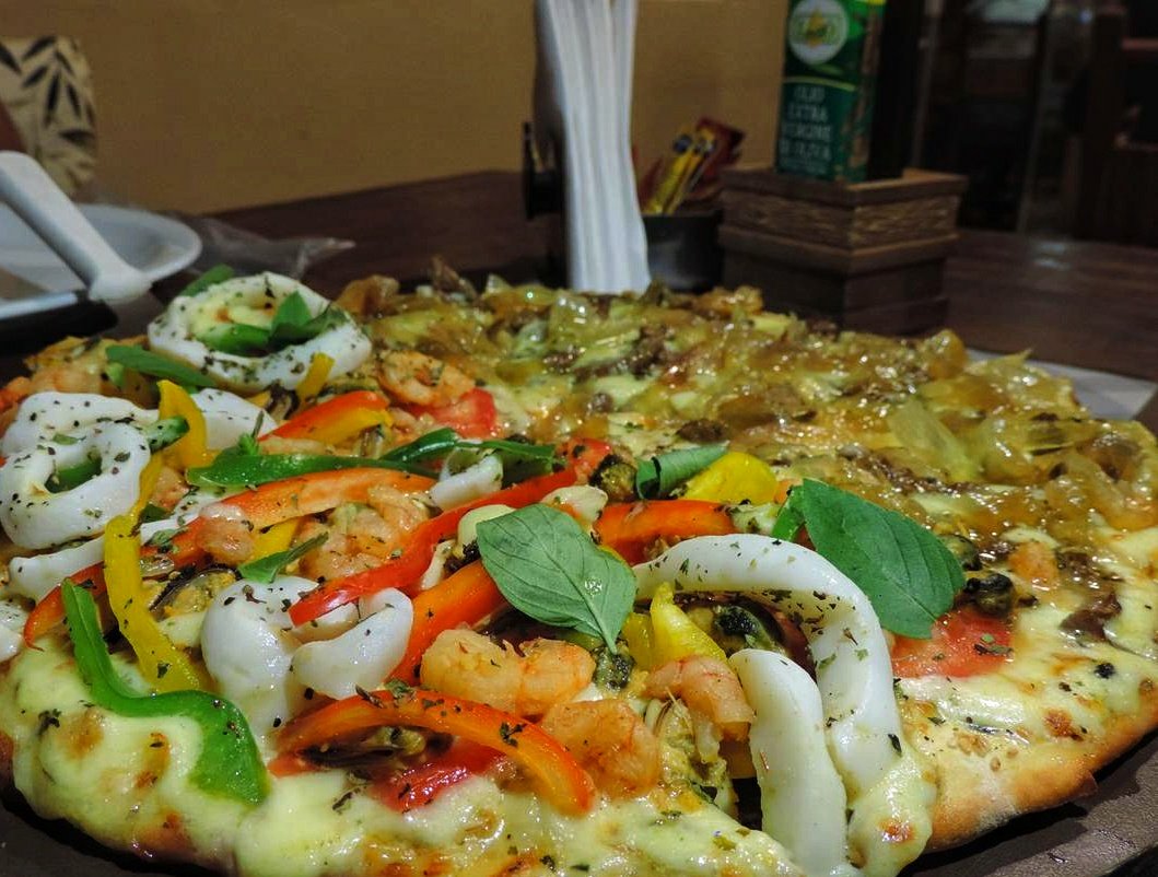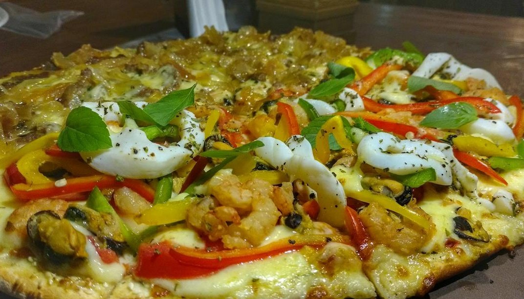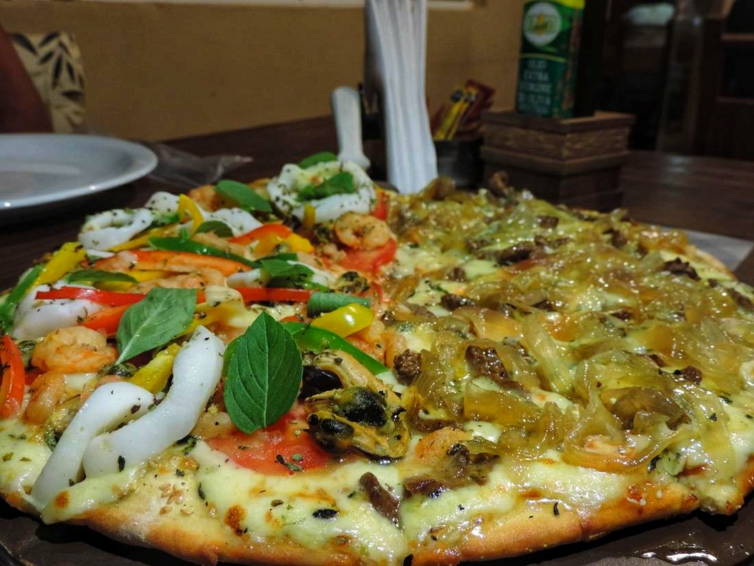 Então optamos por saborear o que nunca tínhamos provado, a escolha foi 1/2 Viña del Mal (com camarões, mexilhões e lula) e 1/2 Vira Vício (com cebola caramelizada, gorgonzola e iscas de filé mignon). Realmente o pedido nos surpreendeu de tamanha delícia.