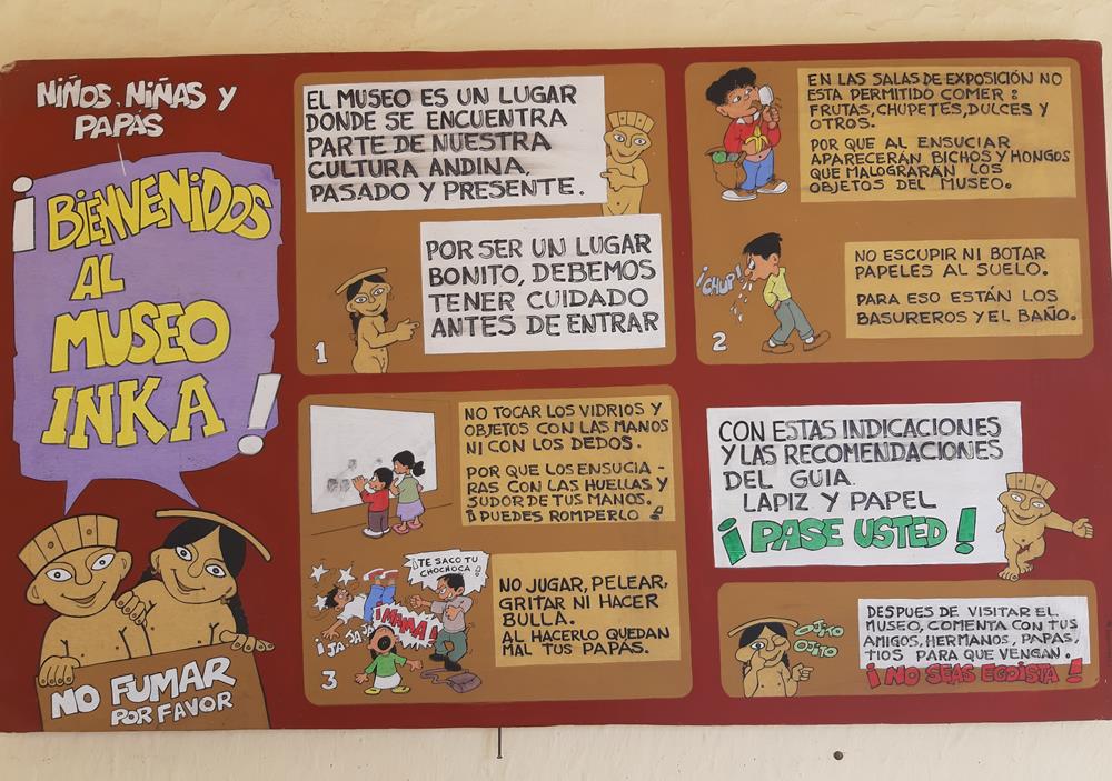 Como na maioria dos museus é proibido filmar e fotografar dentro das salas. São dois andares de exposições. No primeiro piso, são expostos achados arqueológicos e paleontológicos. Há fósseis de dinossauros encontrados na região, pinturas rupestres, muitas cerâmicas, metais e pedras. No segundo piso encontram-se sete salas que contam um pouco da história da desestruturação da civilização Andina que começou com a chegada dos Espanhóis em 1532. Uma das salas conta um pouco sobre a gastronomia Cusqueña e a importância do Pisco que é uma bebida alcoólica típica da região, tem ainda trajes e móveis típicos da época além de uma sala dedicada a Tupac Amaru II um líder indígena que conduziu a maior rebelião anticolonial da América no século XVIII. Embora a rebelião não tenha tido sucesso, Túpac Amaru II acabou por se tornar uma figura mística, inspirando inúmeros movimentos pela independência do Peru e também a luta pelos direitos dos povos indígenas.