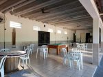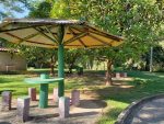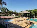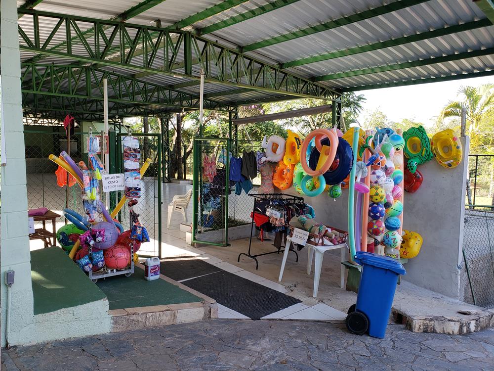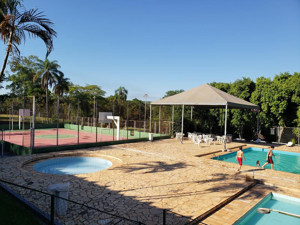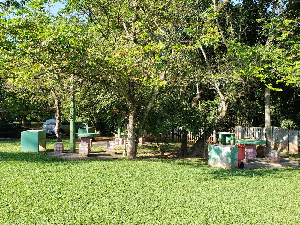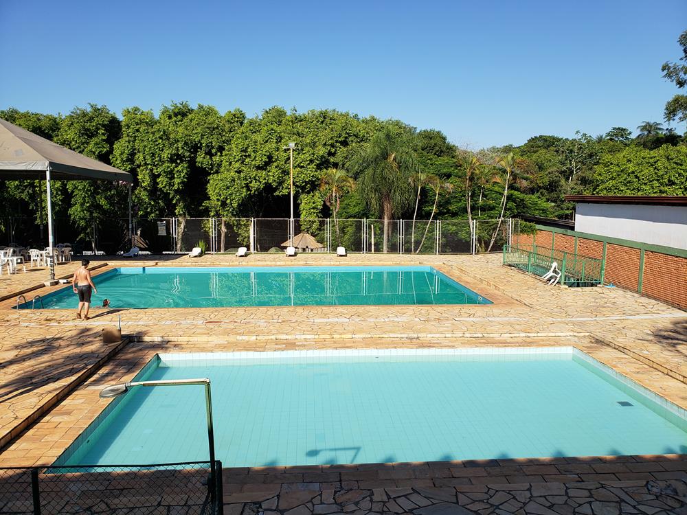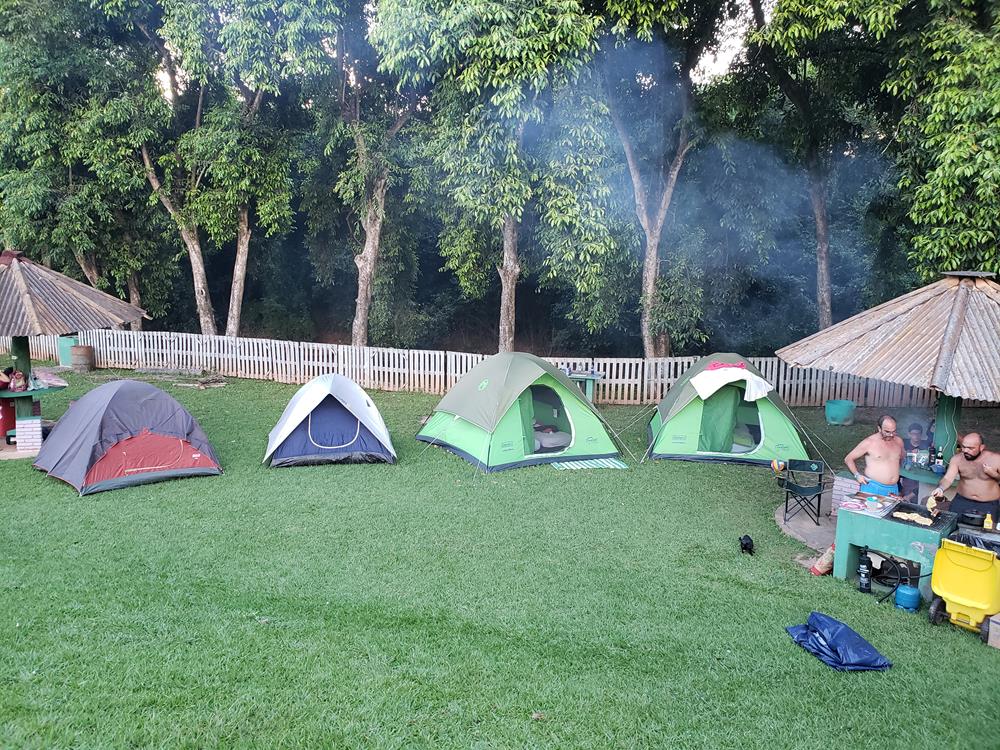 O camping conta com uma pequena área gramada para barracas e tem churrasqueiras e pontos de energia elétrica. Os carros ficam guardados do lado de fora no estacionamento do camping. Tem 3 piscinas, quadra , campo de futebol e um barracão coberto com bar e restaurante. Os vestiários da piscina tem sido utilizado também para os campistas mas tem um outro banheiro fechado com chaves que apenas os campistas utilizam.