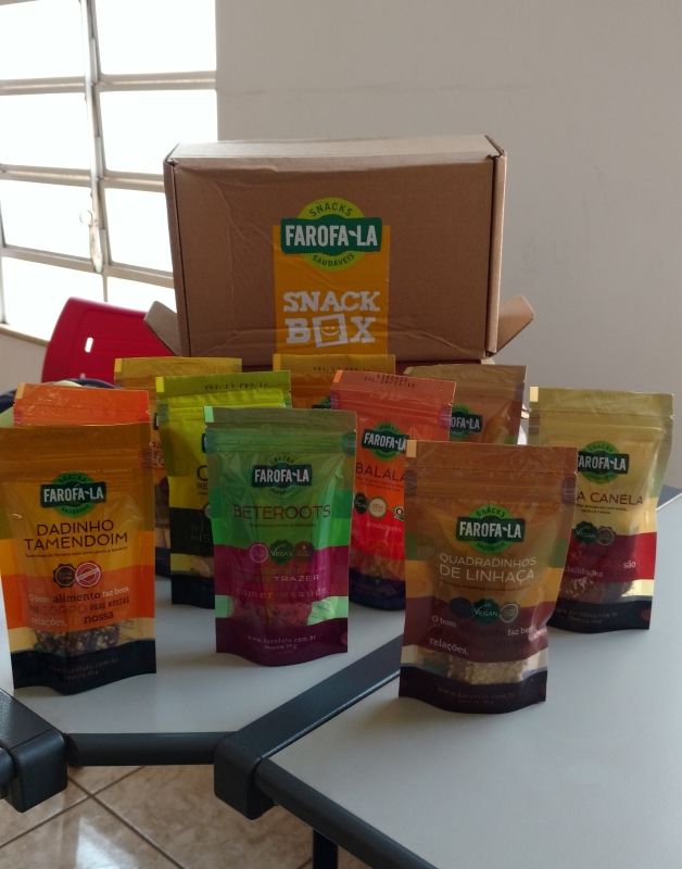 A empresa Farofa.la trabalha com box deliciosos que chega na sua casa cheio de snacks e comidinhas que são escolhidas a dedo. Uma alimentação saudável que pode ser inserida naquele lanchinho da tarde que comemos para enganar a fome, aquele biscoito que acompanha o cafezinho, o docinho depois do almoço e claro em nossas acampadas, trilhas e também na praia!